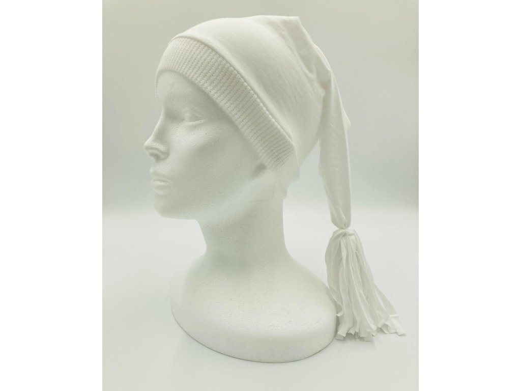 U obvodu hlavy 60-70cm, délka čepice 70cm včetně střapce +- 3cm.