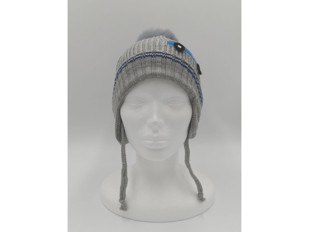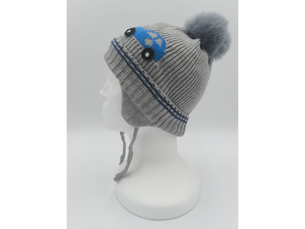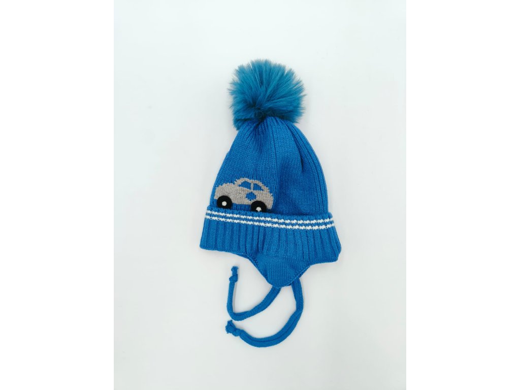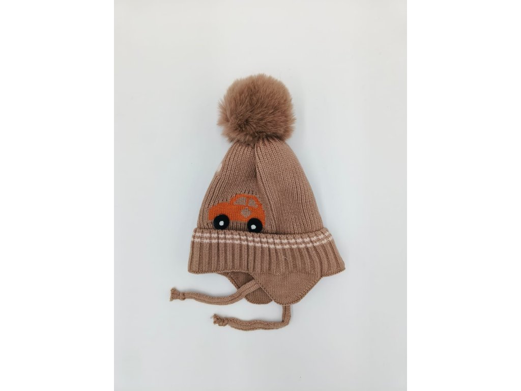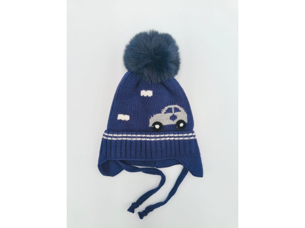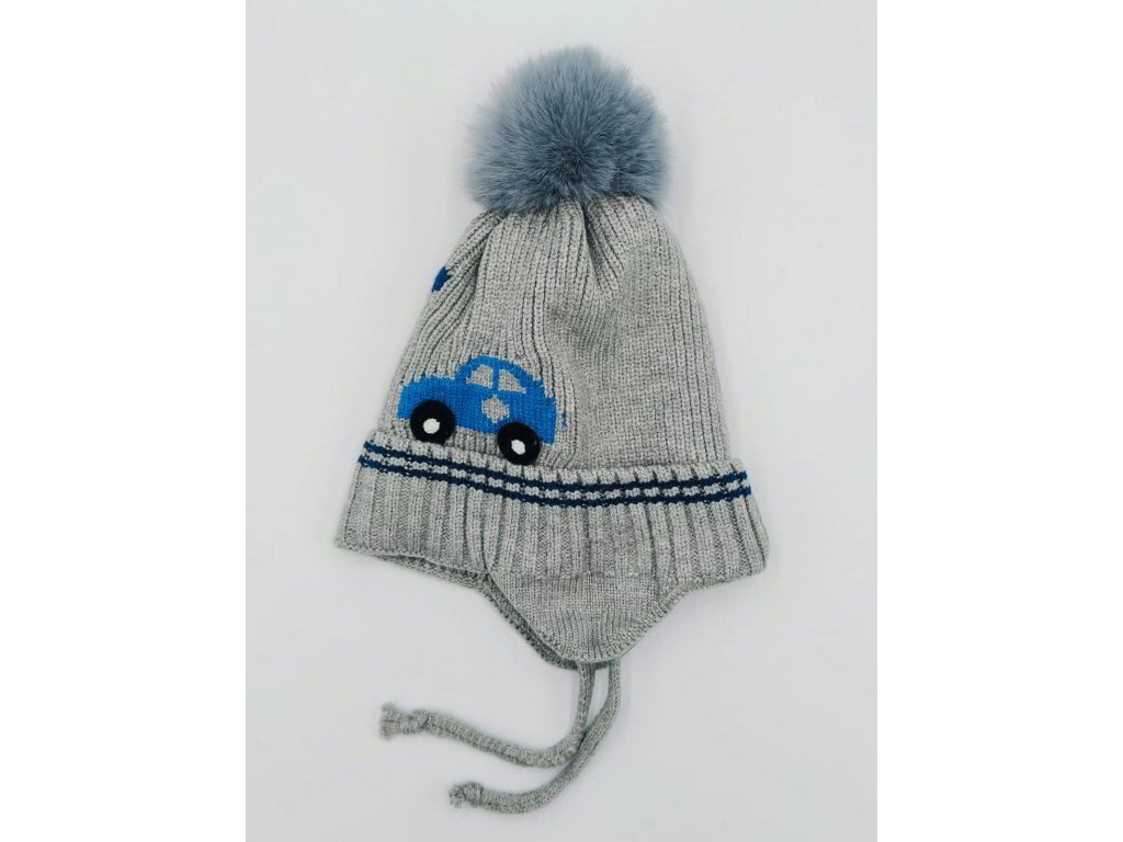 Velmi příjemná dětská čepice, typ ušanka, celopodšitá tenkým bavlněným sametem, zdobená kožešinovou bambulkou a motivem auta, čepice je zavazovací s překrytím na uši, velikost je velmi univerzální.