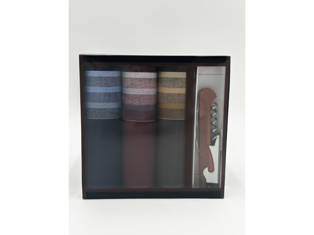 Sada obsahuje 3 kusy kvalitních pánských bavlněných kapesníků a kapesní nožík.