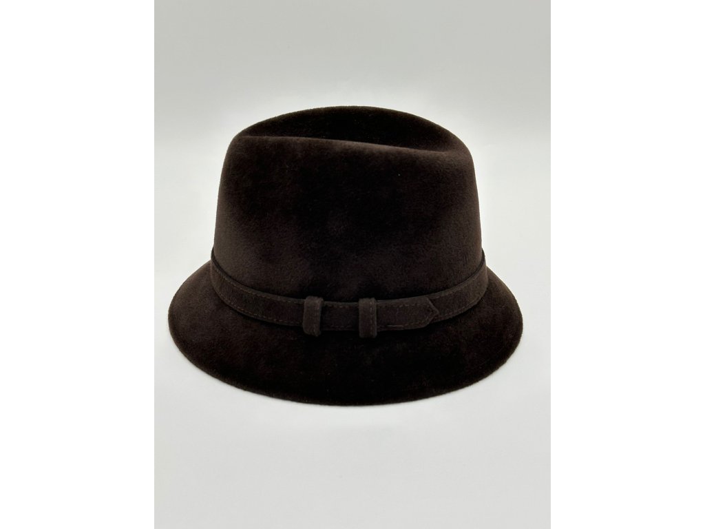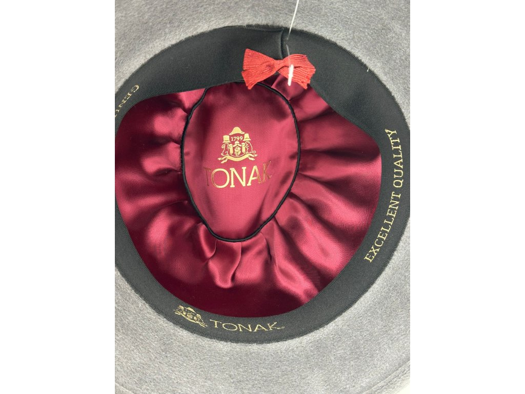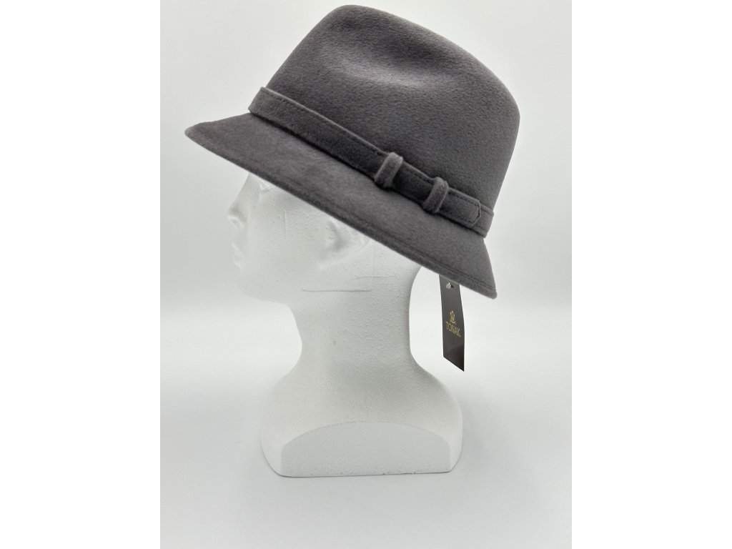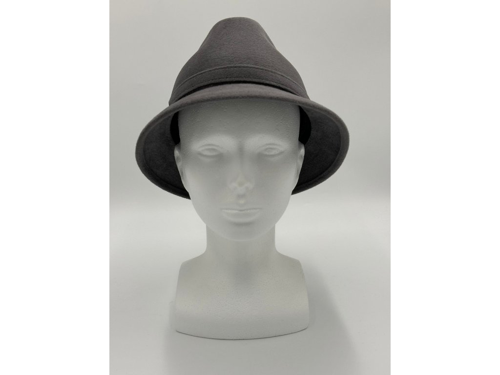 Pánský klobouk s králičí srstí v šedé barvě s ozdobným páskem, výrobce Tonak se inspiroval 30. až 40. lety 20.století, kdy byl tento klobouk velmi populární.
