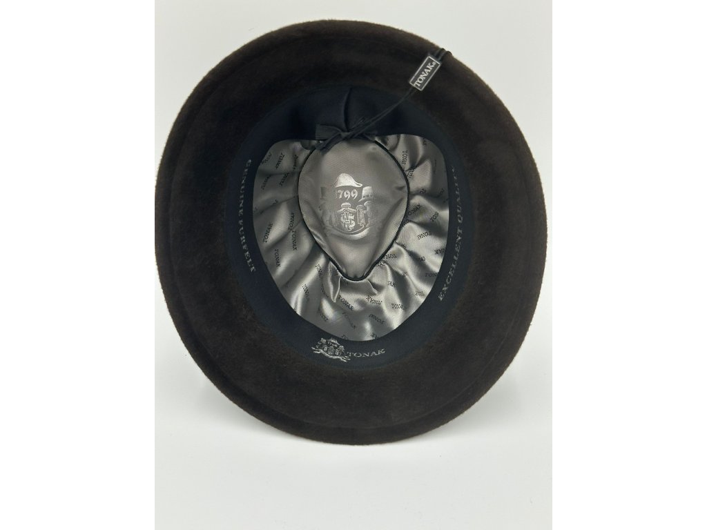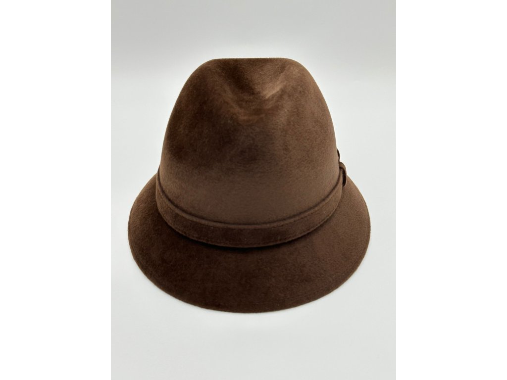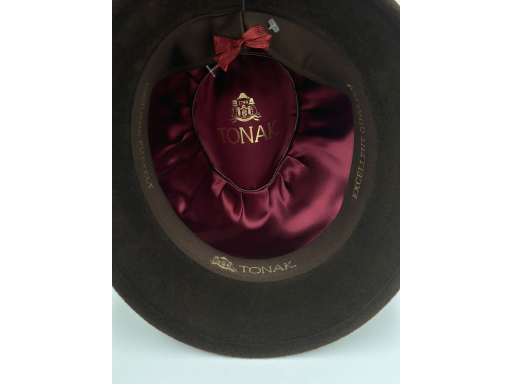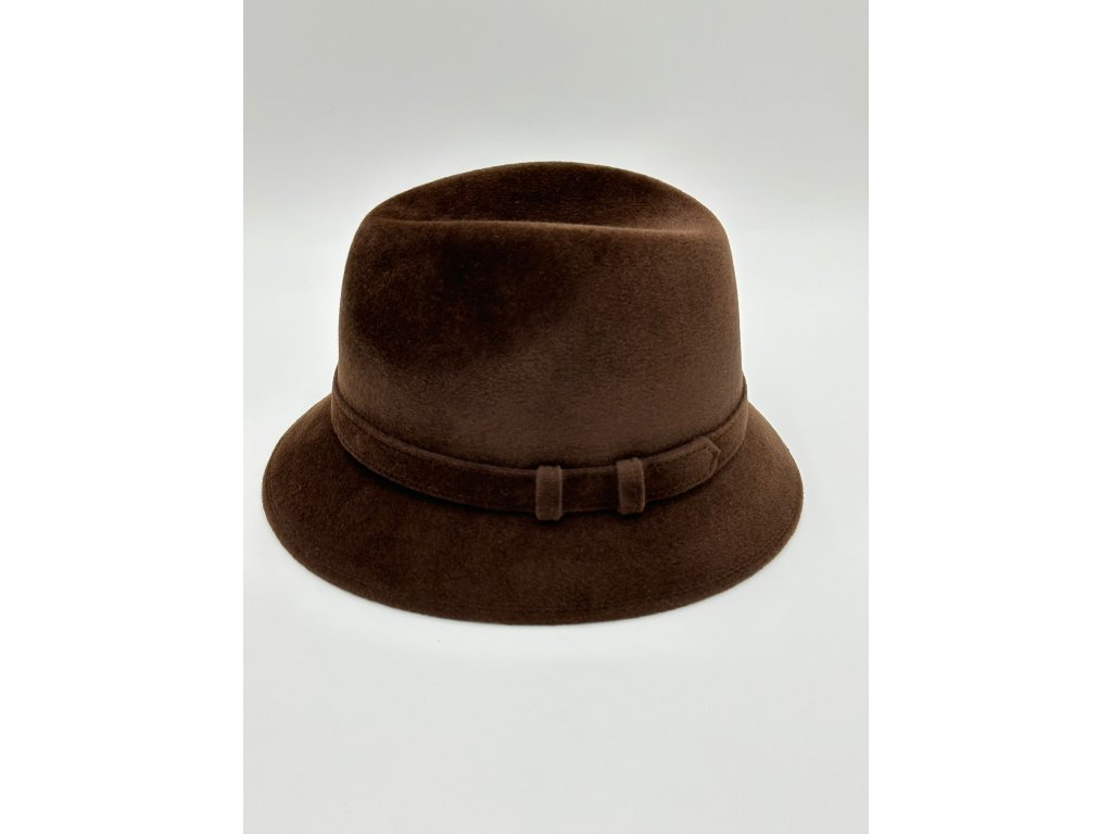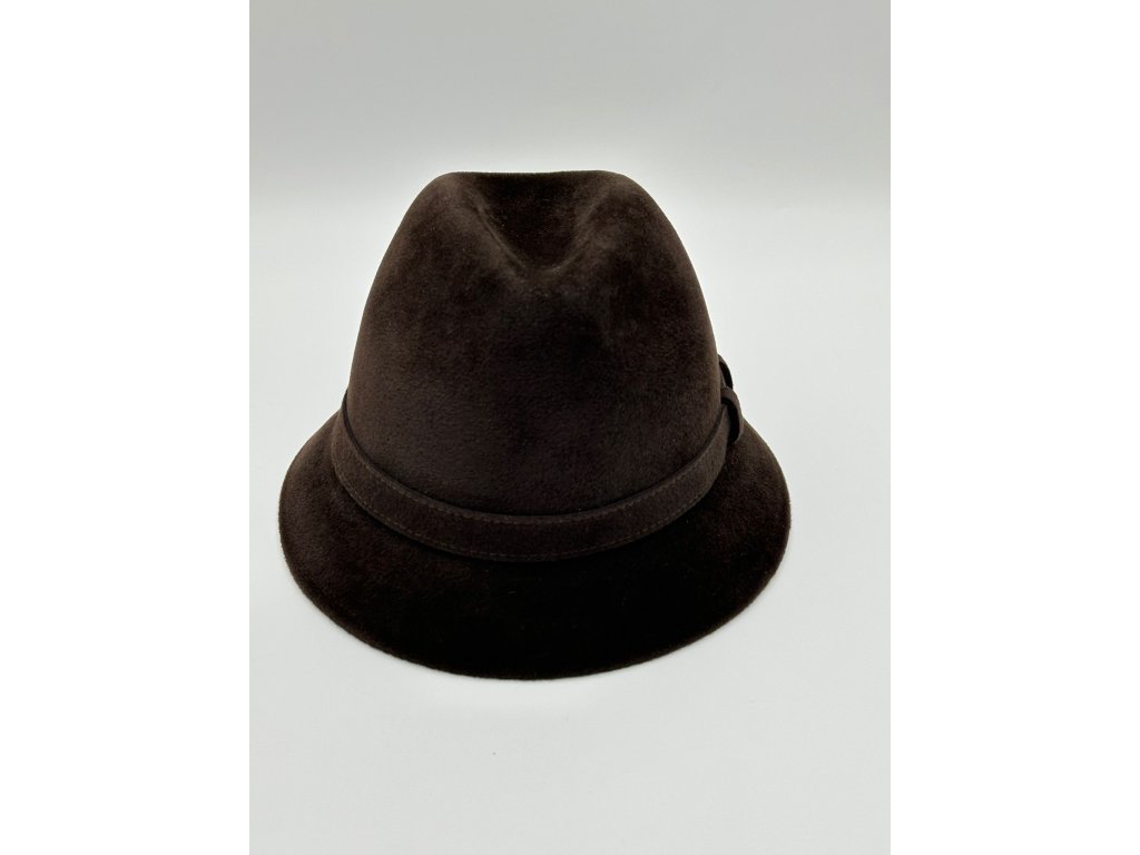 Pánský klobouk s králičí srstí v šedé barvě s ozdobným páskem, výrobce Tonak se inspiroval 30. až 40. lety 20.století, kdy byl tento klobouk velmi populární.