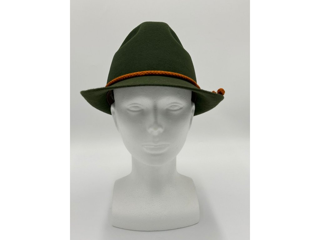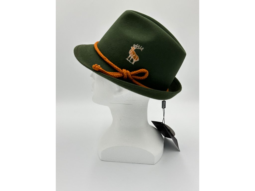 Slušivý myslivecký klobouk s výšivkou jelena na boku.