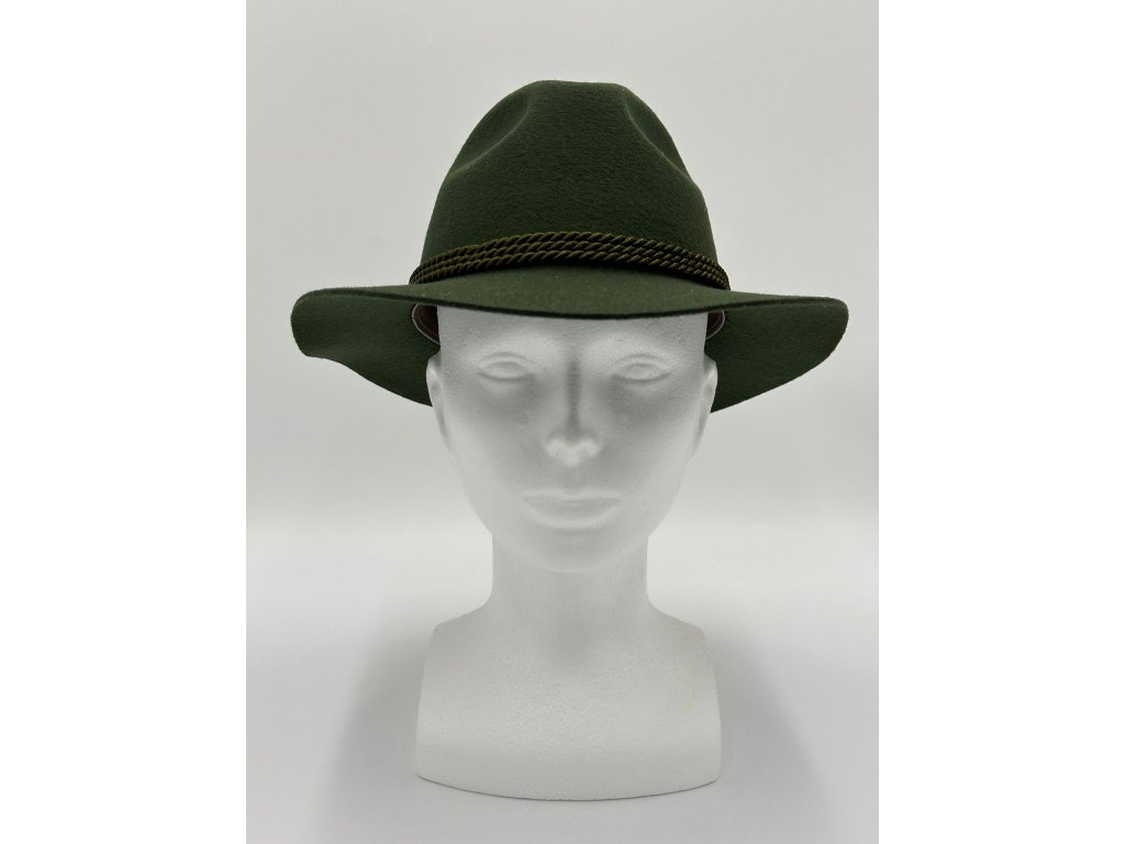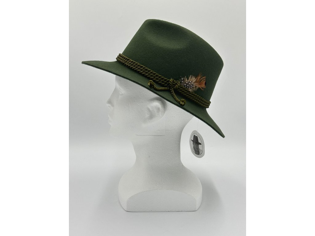 Slušivý vlněný myslivecký klobouk s pírkem na boku.