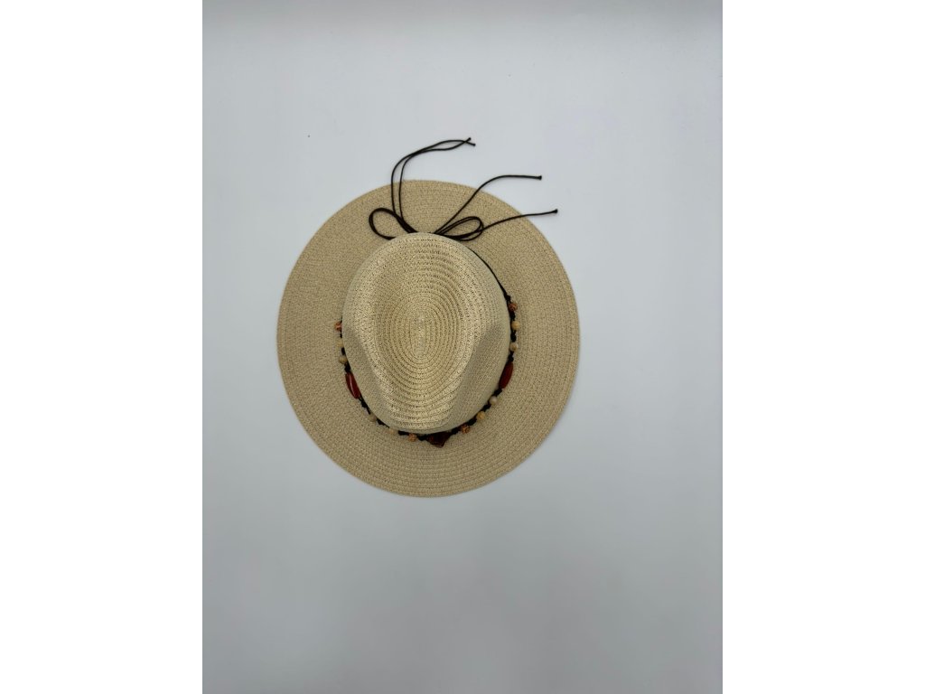 Papírový slamák je zdobený umělými jantary a plastovými korálky na šňůrce.